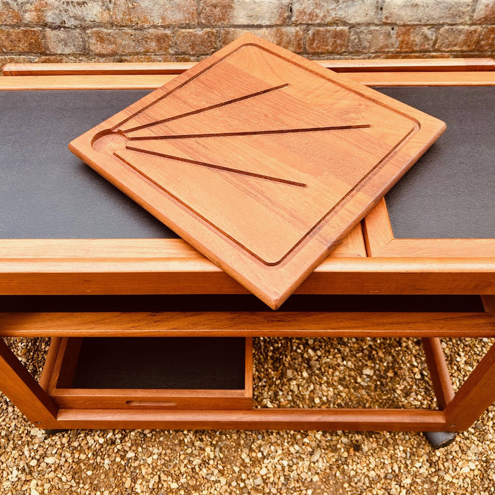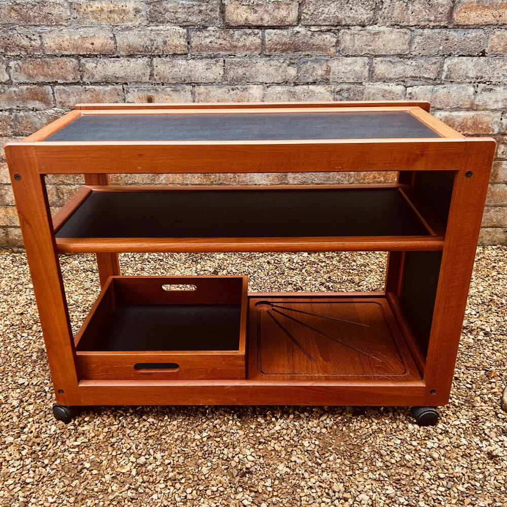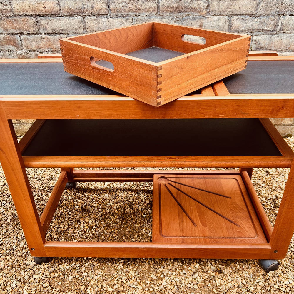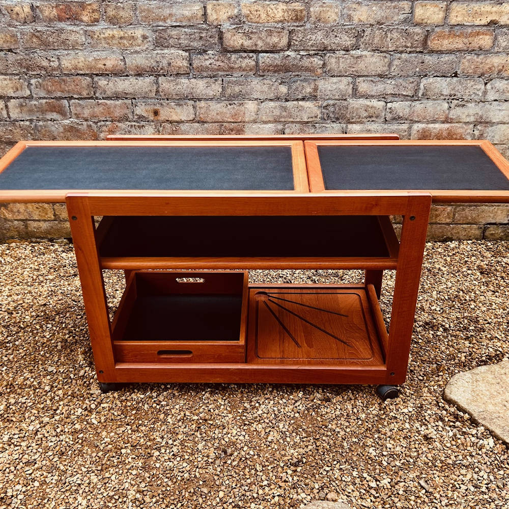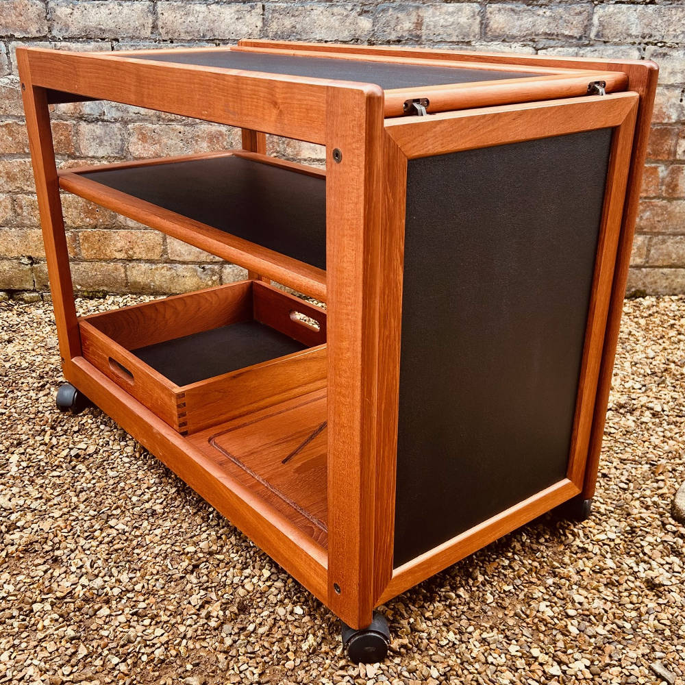 A beautifully made Danish teak drinks trolley dating from the 1960s, with a clean architectural frame and a practical, well-considered design. The top extends to create a larger serving surface, making it an ideal piece for entertaining, while the black inset panels add a smart contrast to the warmth of the teak.