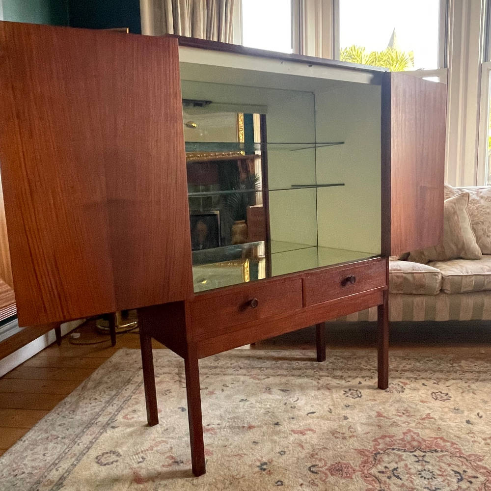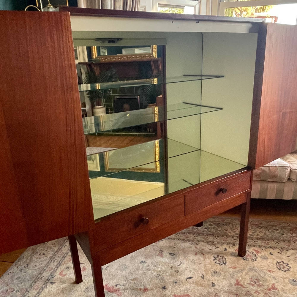 The cabinet presents with plain teak slab doors, round timber pulls and tall stilted legs. Inside, it opens to a mirrored bar interior with glass shelves — perfect for displaying glassware and bottles, catching the light beautifully when in use. Two dovetailed birch drawers sit neatly below, providing additional storage for barware or linens.