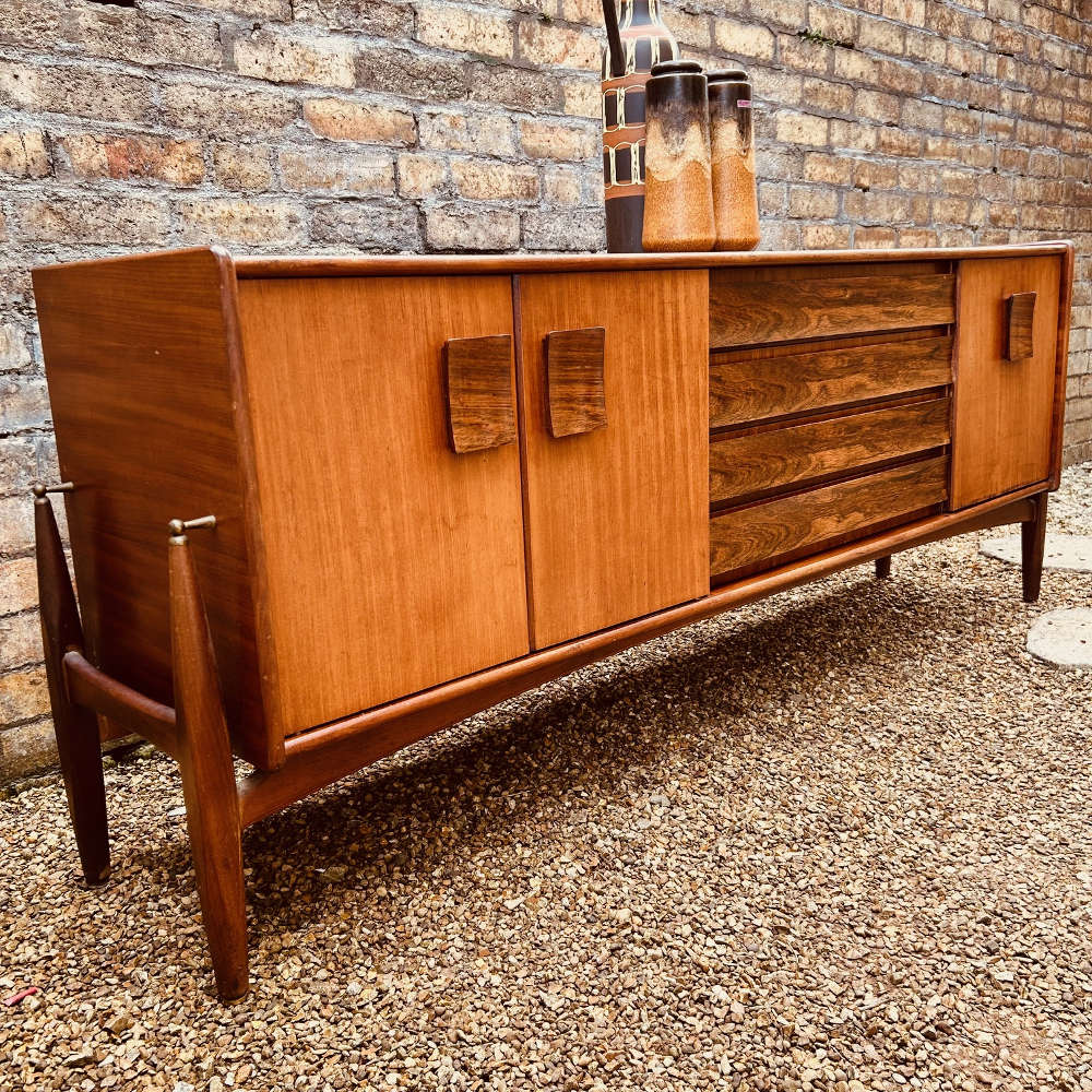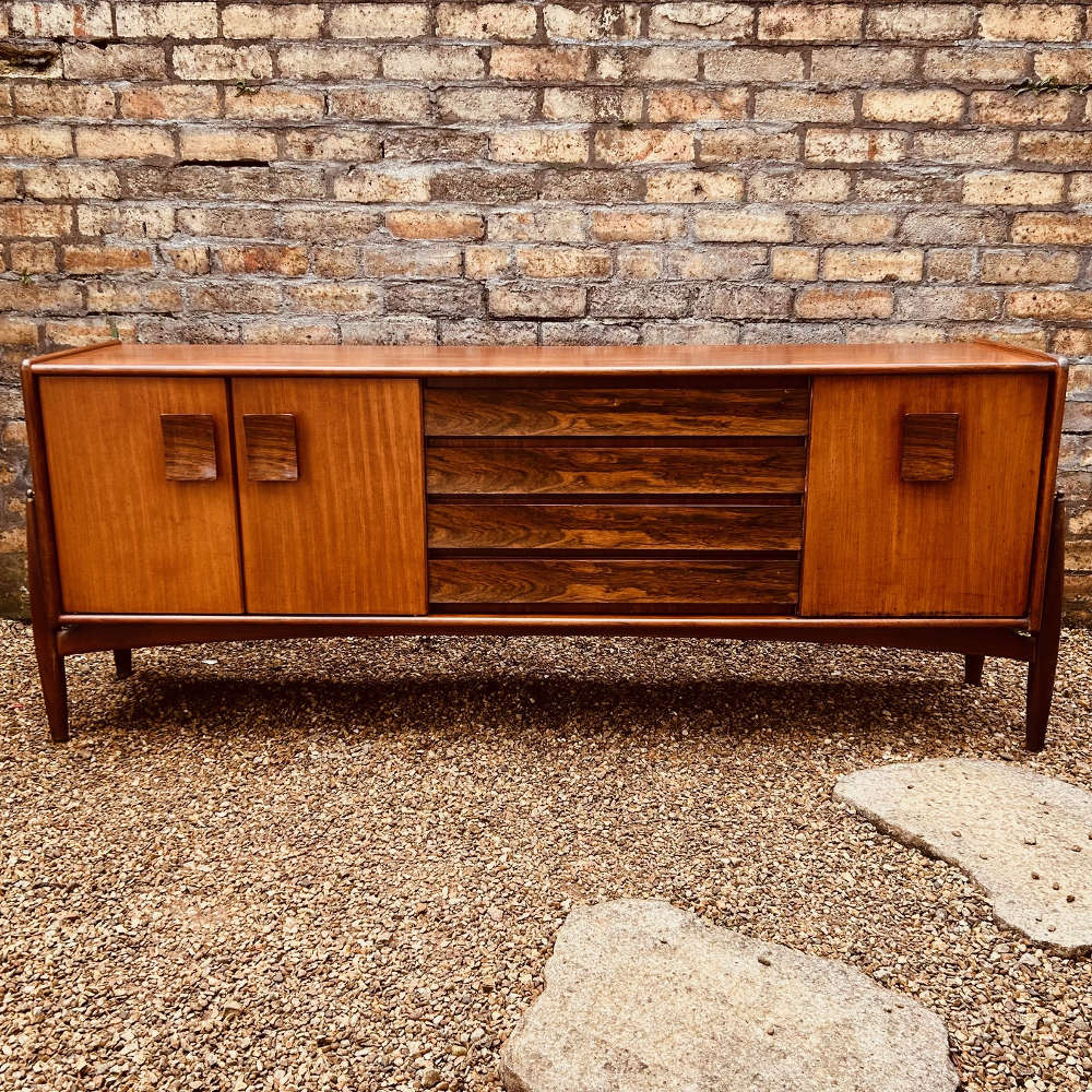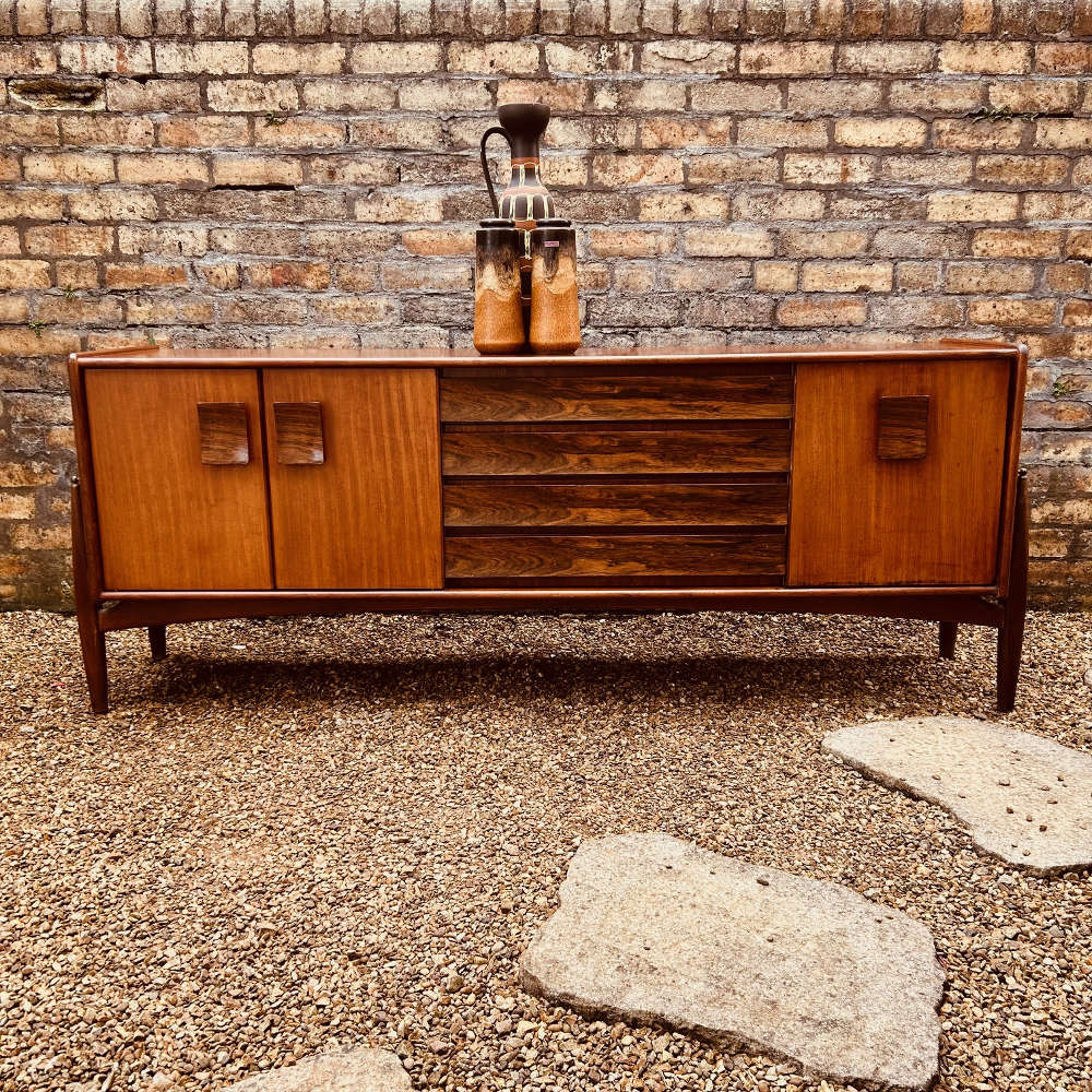A beautifully made sideboard by Elliot’s of Newbury, dating from the 1960s. Crafted in warm teak with contrasting rosewood drawer fronts, it’s a perfect example of refined British modernism.