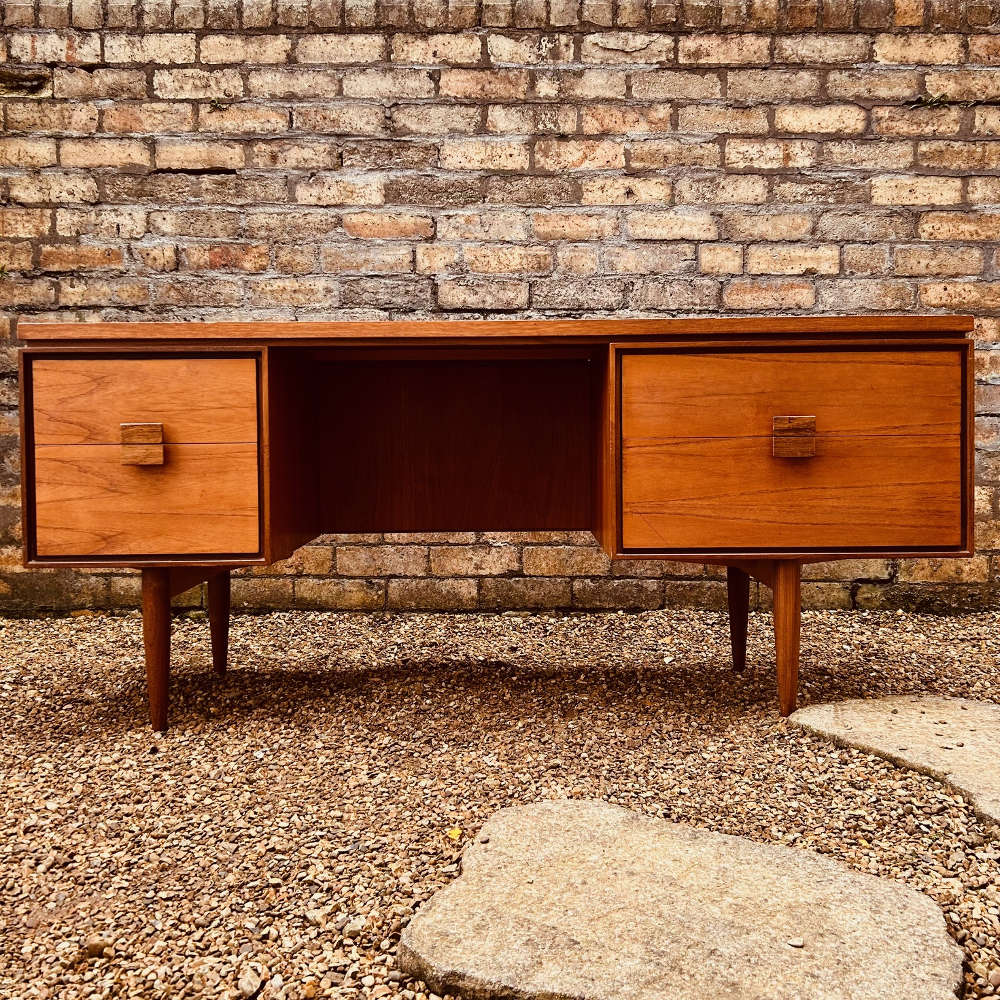 A beautifully proportioned G-Plan Danish Range desk, designed by Ib Kofod-Larsen and dating to 1962. Clean, confident lines with warm teak grain, distinctive square timber pulls, and a floating profile on tapered legs.