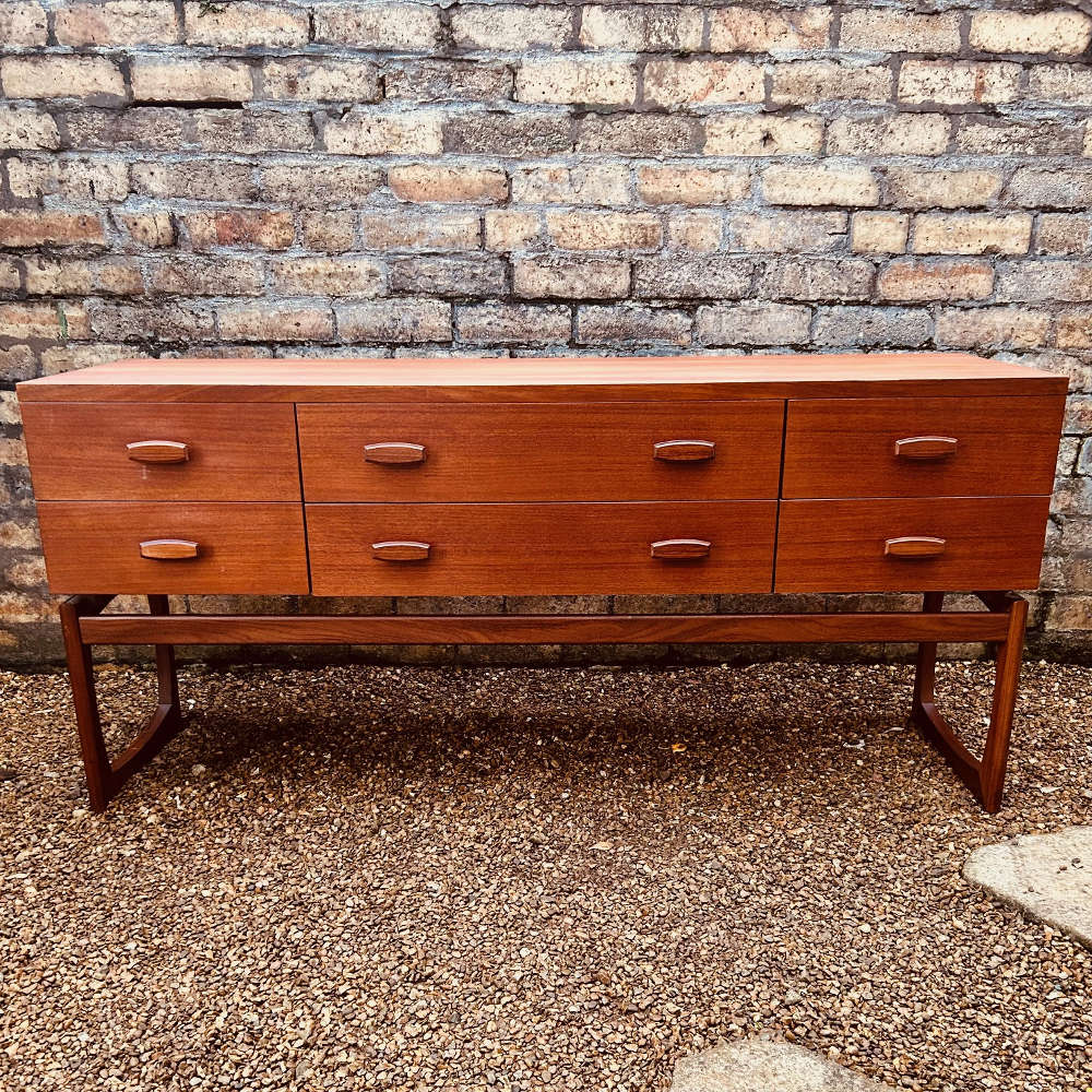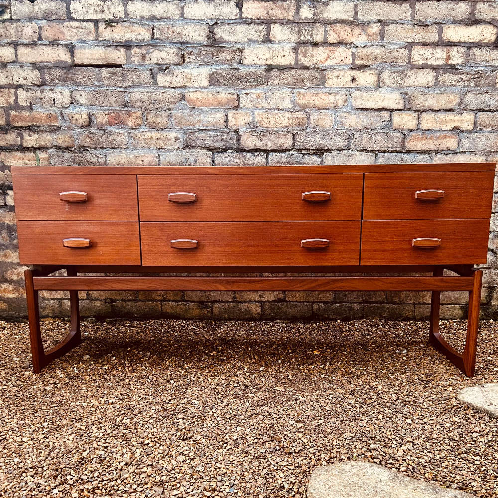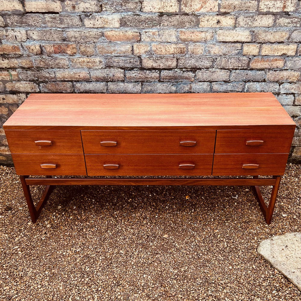 A beautifully proportioned G-Plan Quadrille long low chest of drawers in rich teak tones, with the signature sculpted handles and an open frame base that keeps the look light and architectural. The six spacious drawers offer excellent storage and run well, making it a brilliant all-rounder for a bedroom, hallway or landing, and it also works perfectly as a low media unit thanks to its long, clean profile.