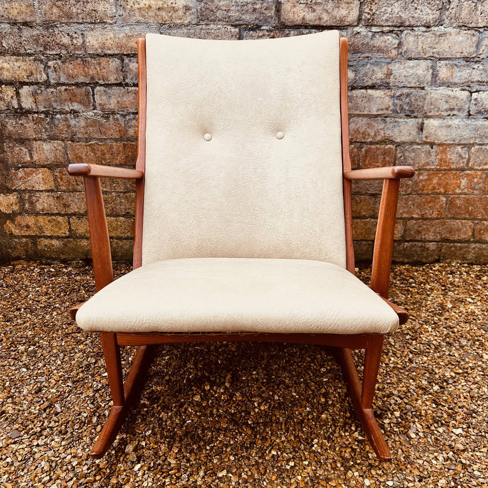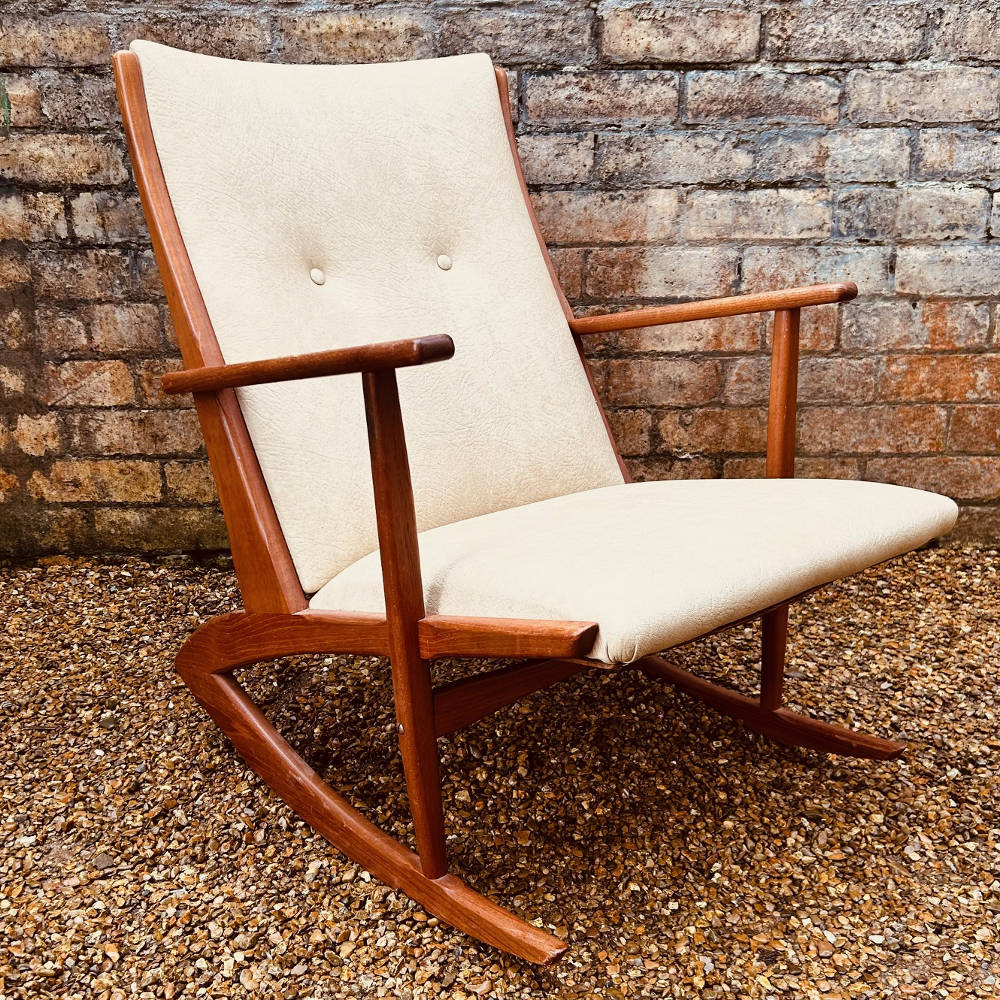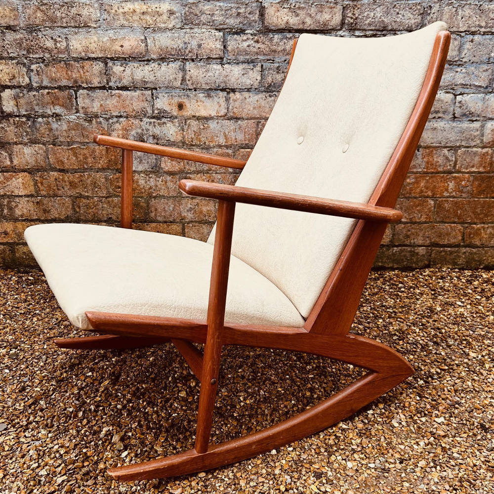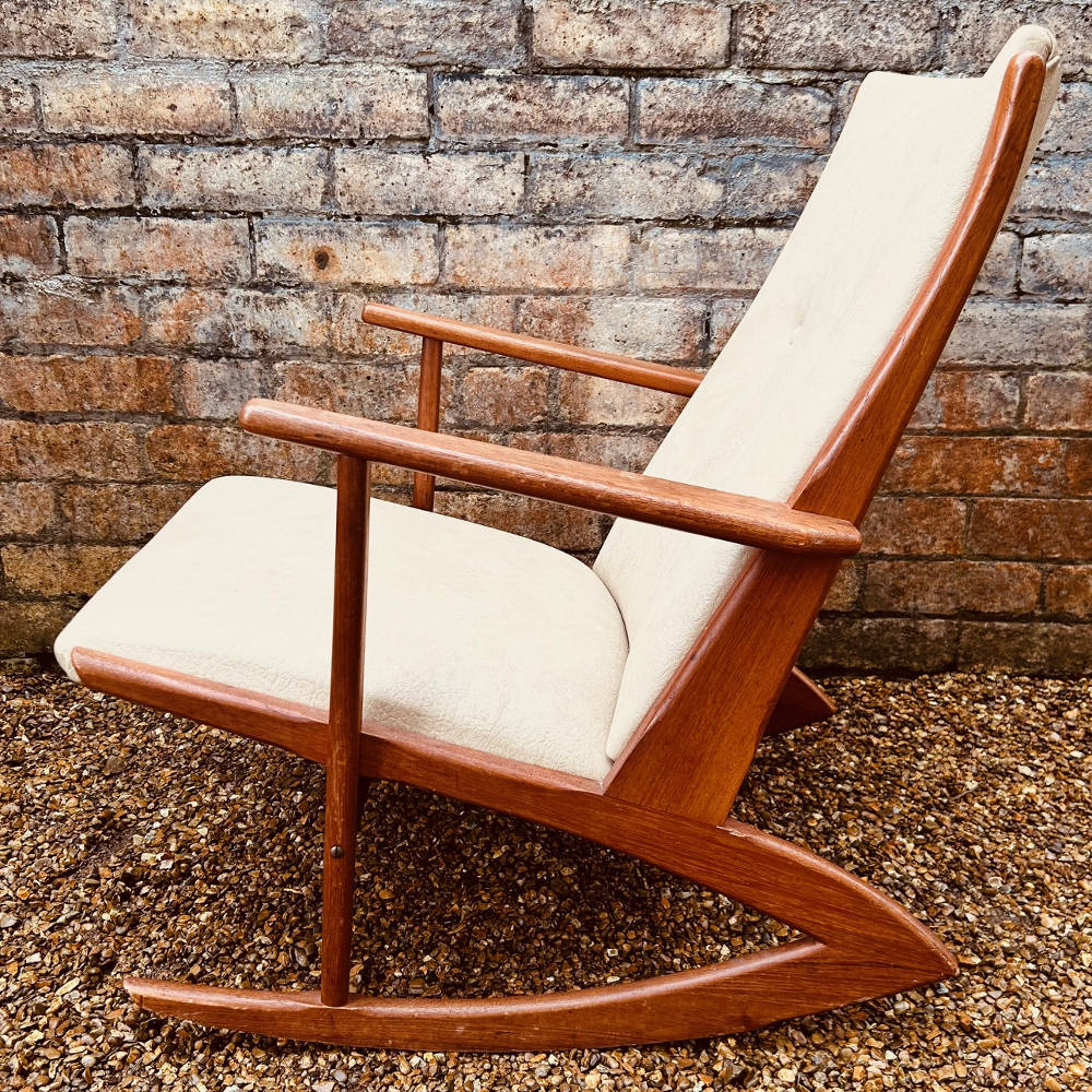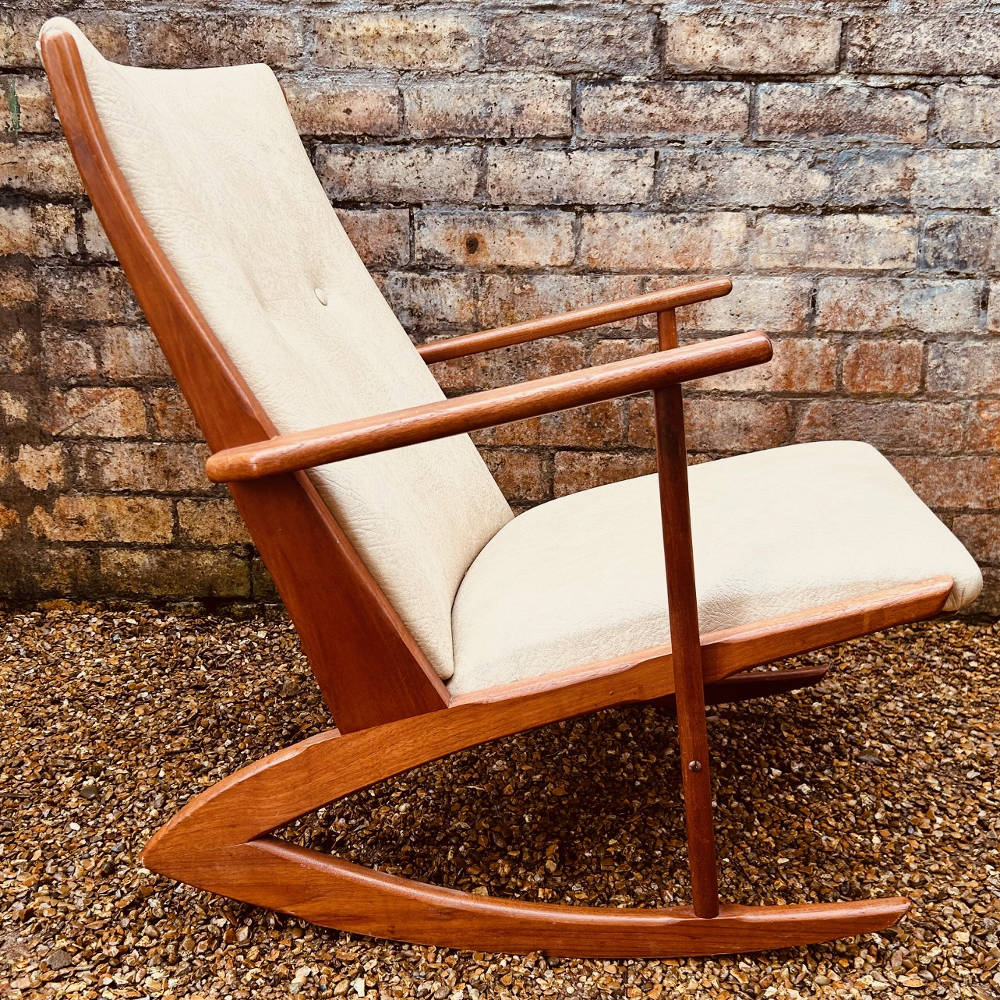 Model 97 is one of the more distinctive Danish rocker designs, with its elegant boomerang-shaped base, clean architectural frame, and gently reclined profile. The solid teak frame has a lovely warmth and grain, paired with a simple, well-proportioned upholstered seat and back.