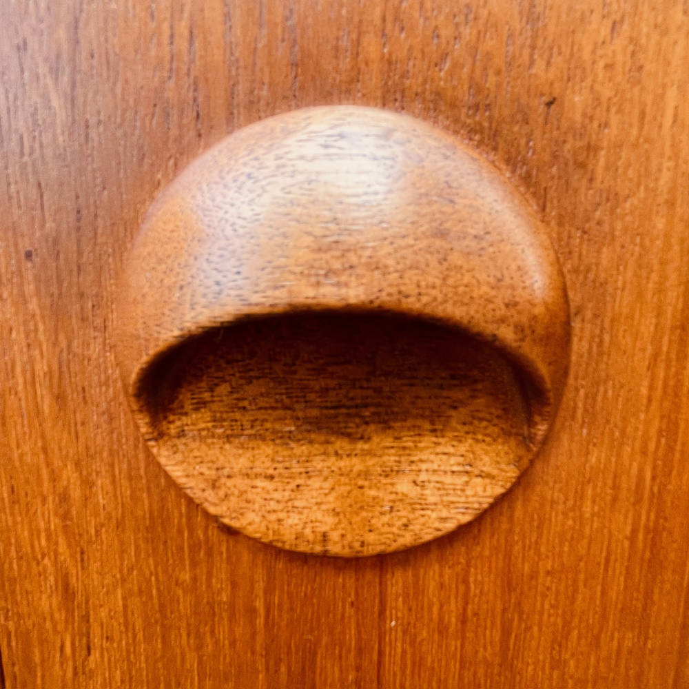 Made from richly toned teak, this piece shows off the elegant simplicity that defined McIntosh furniture — sculpted drawer handles, circular recessed door pulls, and a refined floating frame on tapered legs.