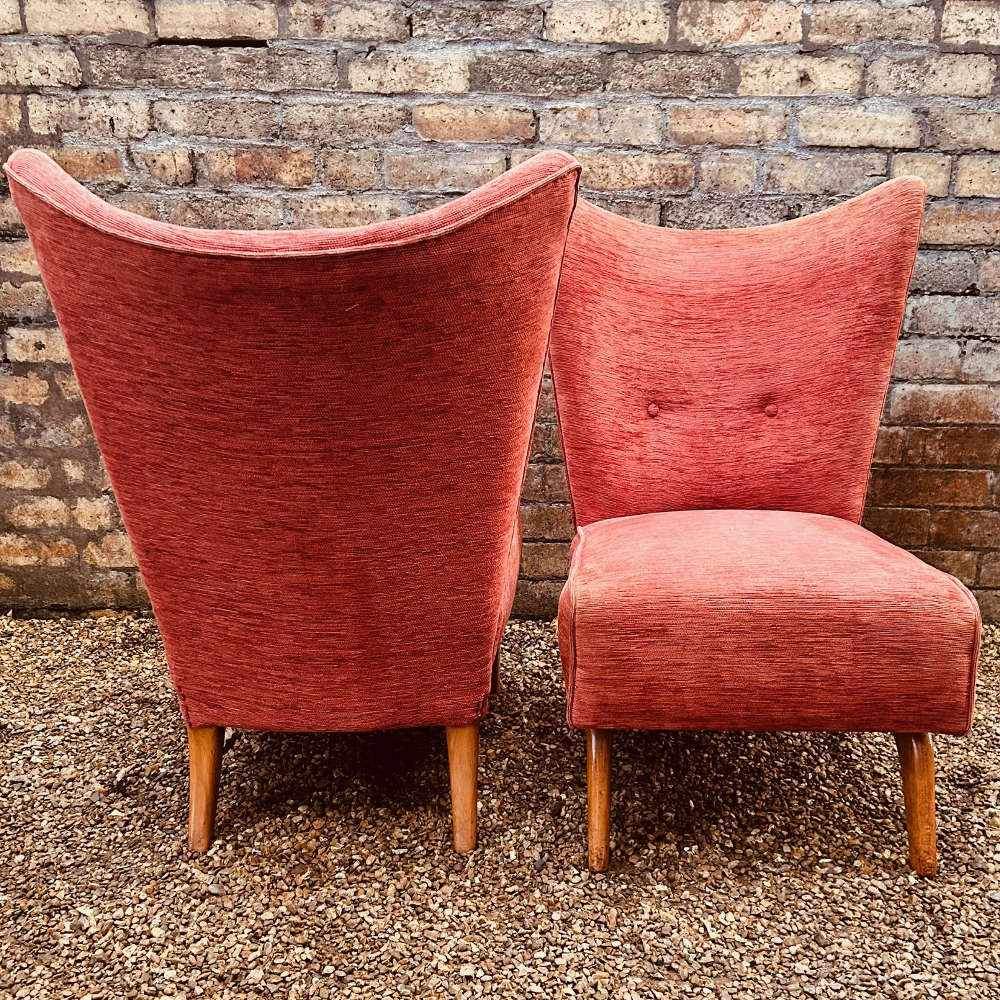 These chairs showcase classic British mid-century design with sculptural winged backs, deep comfortable seats and elegant solid beech legs. The gently curved backrests and subtle button detailing give them real presence without overwhelming a space.