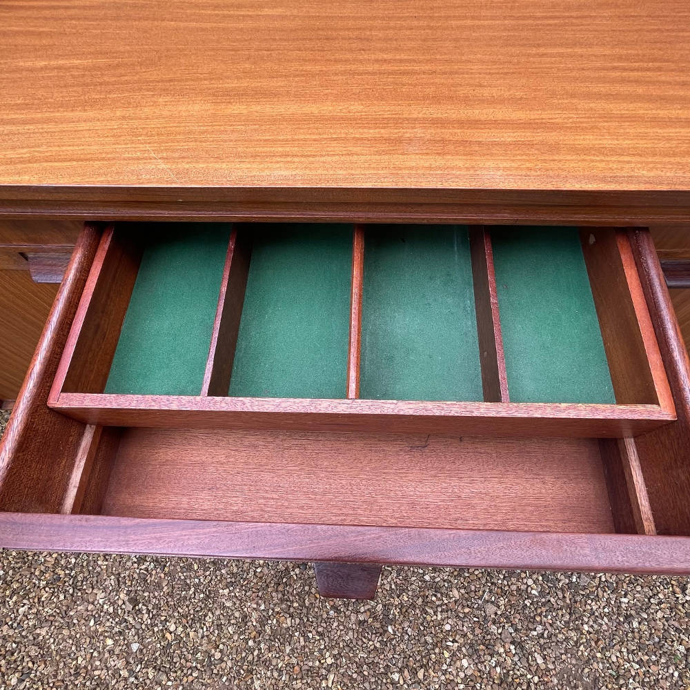 The central bank of three drawers includes a green baize-lined cutlery drawer with dividers, while the spacious cupboards on either side provide generous storage. Elevated on tapering legs, this piece has a refined, architectural presence that works as well in a contemporary setting as it does in a vintage-inspired interior.